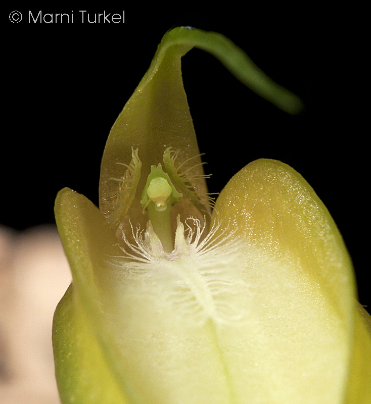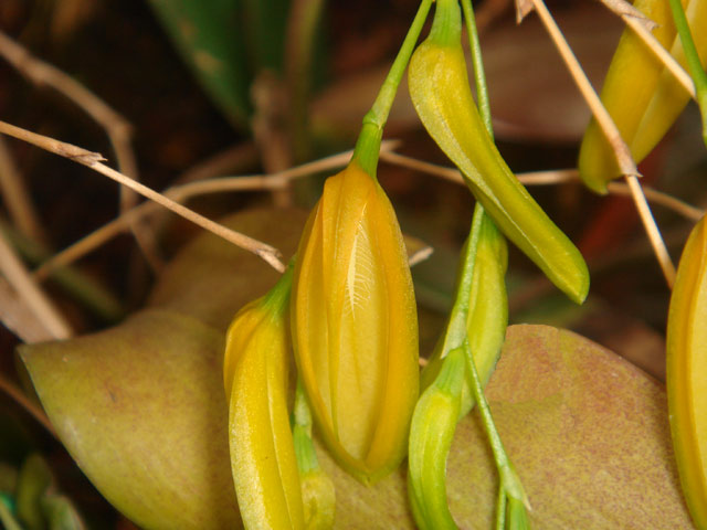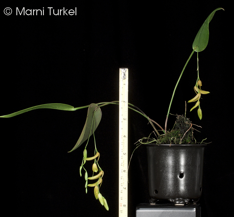 Found in Ecuador at elevations around 1500 meters as a small sized, coolgrowing epiphyte with slender, erect to horizontal ramicaul enveloped by a tubular sheath below the middle and 2 to 3 others at the base and carrying a single, apical, erect, coriaceous, elliptical, acute, cuneate below into the sessile base leaf that blooms in the summer on a pendent to arching, flaccid, distichous, 2.8 to 4" [7 to 10 cm] long, simultaneously few flowered inflorescence without a spathe and has a tubular floral bract.