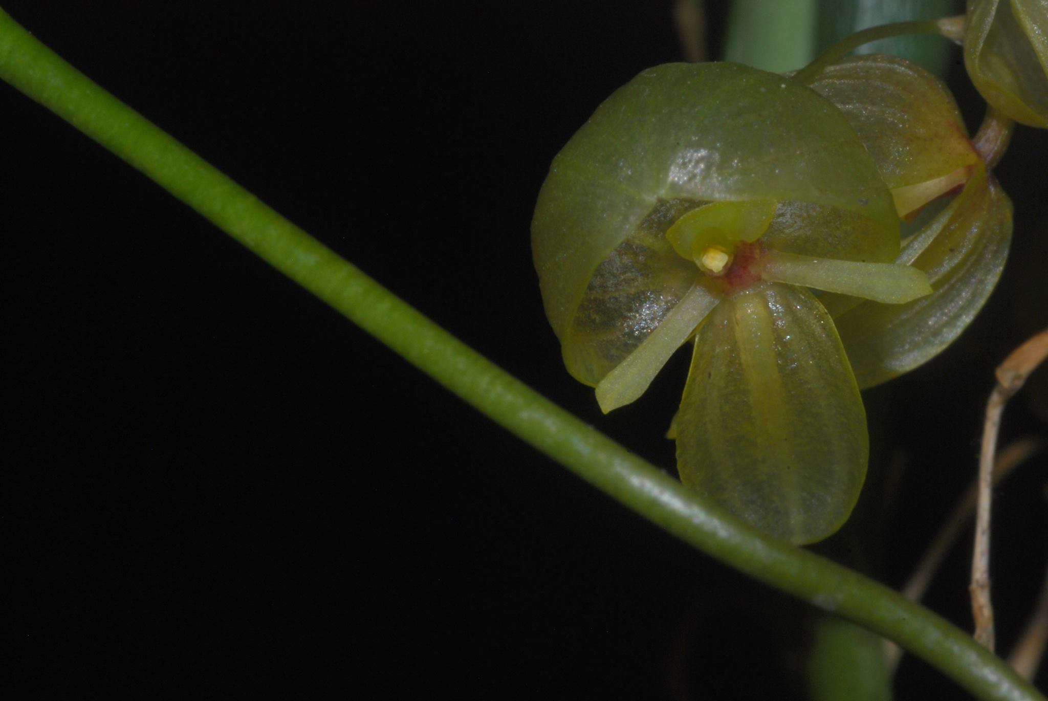 Found in Morona-Santiago Ecuador at elevations around 1200 meters as a miniature to small sized, cool growing epiphyte with slender, erect ramicauls with a tubular sheath near the middle and 2 to 3 others at the base and carrying a single, apical, erect, coriaceous, narrowly elliptical, acute, cuneate below into the sessile base leaf that blooms on 1 to 3, loose, pendent, slender, arcuate, to 1" [2.5 cm] long including the .4 to .6" [1 to 1.5 cm] long peduncle, successively 2 to 3 flowered inflorescence arising through a spathe at the base of the leaf and carries a non-resupinate flower.