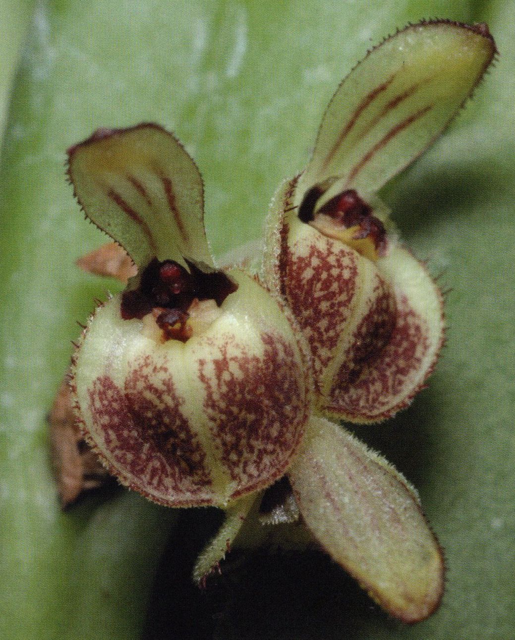 Found in Peru at upper elevations as a miniature to small sized, cold growing epiphyte with erect, sharply three winged, slightly broader at the leaf junction ramicauls with 2 to 3 tubular sheaths at the base and carrying a single, apical, erect, rigidly coriaceous, narrowly elliptical, acute, the wings of the ramicaul continuous with the sessile base leaf that blooms in the fall on a congested, to .2 to .24" [5 to 6 mm] long including the .12" [3 mm] long peduncle, successively 2 to 3 flowered inflorescence arising through a fugaceous spathe at the base of the leaf.