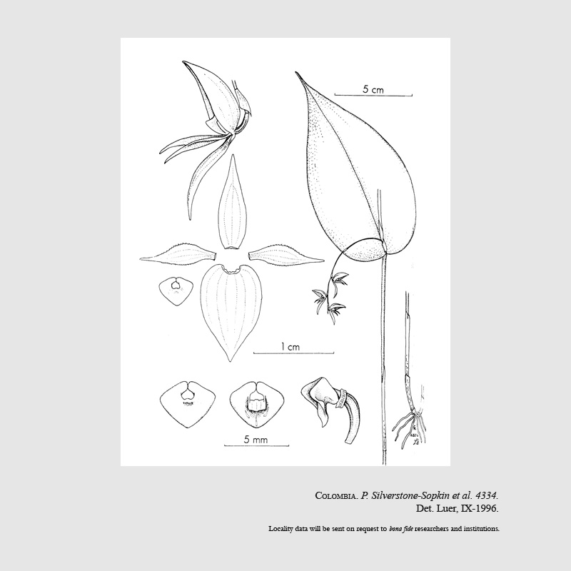 Found in Choco' department of Colombia at elevations around 1900 to 2000 meters as a medium sized, cool to cold growing terrestrial with erect, slender, prolific ramicauls with a tubular sheath below the middle and 2 to 3 others at the base and carrying a single, apical, erect, coriaceous, ovate, slightly acuminate, acute, cordate below into the sessile base leaf that blooms in the later summer through early winter on an arching, pendent,to .2 to 3.2" [ 8 cm] long including the .8 to 1.2" [2 to 3 cm] long peduncle, loosely few flowered inflorescence arising through a spathe at the base of the leaf and carrying non-resupinate flowers.