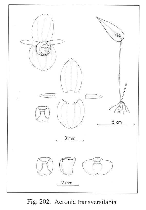 References W3 Tropicos, Kew Monocot list, IPNI ; * Orchids of Venezuela [An illustrated field guide] Vol. 3 Ramiro and Carnevali 2000 drawing fide; Icones Pleurothallidinarum Vol XXVII Luer 2005 as Acronia transversilabia drawing fide;