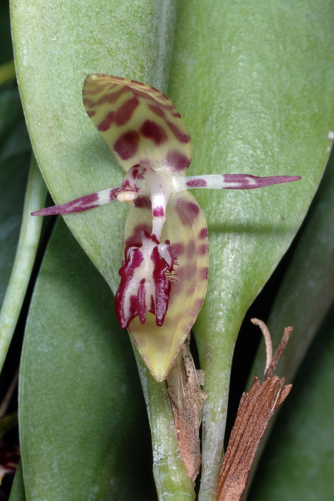 Found most likely in Ecuador, Peru and Bolivia without locational data as a miniature sized epiphyte with erect to suberect, slender ramicauls carryijng a single, apical, erect, oblong-elliptic, acute, narrowing below into the petiolate base leaf that blooms in the fall on an erect, arising through an erect spathe, single flowered inflorescence.