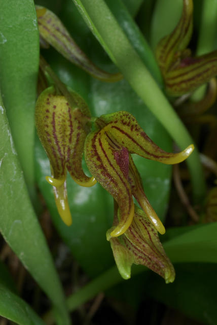 Found in Costa Rica, Panama, Colombia, Venezuela, Ecuador, Peru, Bolivia, Brazil, and Argentina in wet montane forests at elevations of 900 to 2700 meters in altitude as a creeping, miniature sized, warm to cold growing epiphytic species with a very short ramicaul carrying a single, apical, oblong, acute, gradually narrowing below into the conduplicate, petiolate base, coriaceous leaf that blooms in the late spring and summer on a apical, racemose, horizontal to laxly pendulous, 2 3/4" [7 cm] longer than the leaf, loosely flowered inflorescence that has several, simultaneously opening flowers.