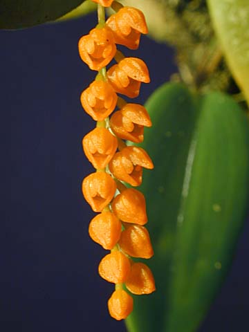 Found in Ecuador at altitudes of 1700 to 3000 meters as a medium to large sized, caespitose, cool to cold growing epiphytic and sometime lithophytic species with elongate, terete, slender ramicauls enveloped basally by 2 close, tubular sheaths and another 2, one at the middle and the other below the middle and carrying a single, apical, elliptic, acute, attenuate to the short conduplicate base leaf that blooms on a 1 or more, apical, racemose, 3 to 4" [7.5 to 10 cm] long, several to many flowered inflorescence arising from a small spathe and holds the successive opening flowers tight against the mid leaf all occuring in the winter and spring.