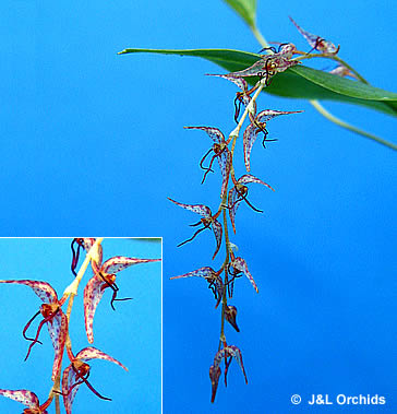 Found in Colombia and Ecuador at elevations around 400 to 1800 meters as a miniature to small sized, hot to cool growing epiphyte with very slender, erect to suberect ramicauls enveloped by a thin, tubular sheath below the middle and another at the base and carrying a single, apical, erect, thinly coriaceous, ovate, acute, rounded to subcordate, sessile base leaf that blooms at most any time of the year on a delicate, flexible, 2.4 to 3.2" [6 to 8 cm] long, loose, several flowered, racemose inflorescence arising from a spathe at the base of the leaf.