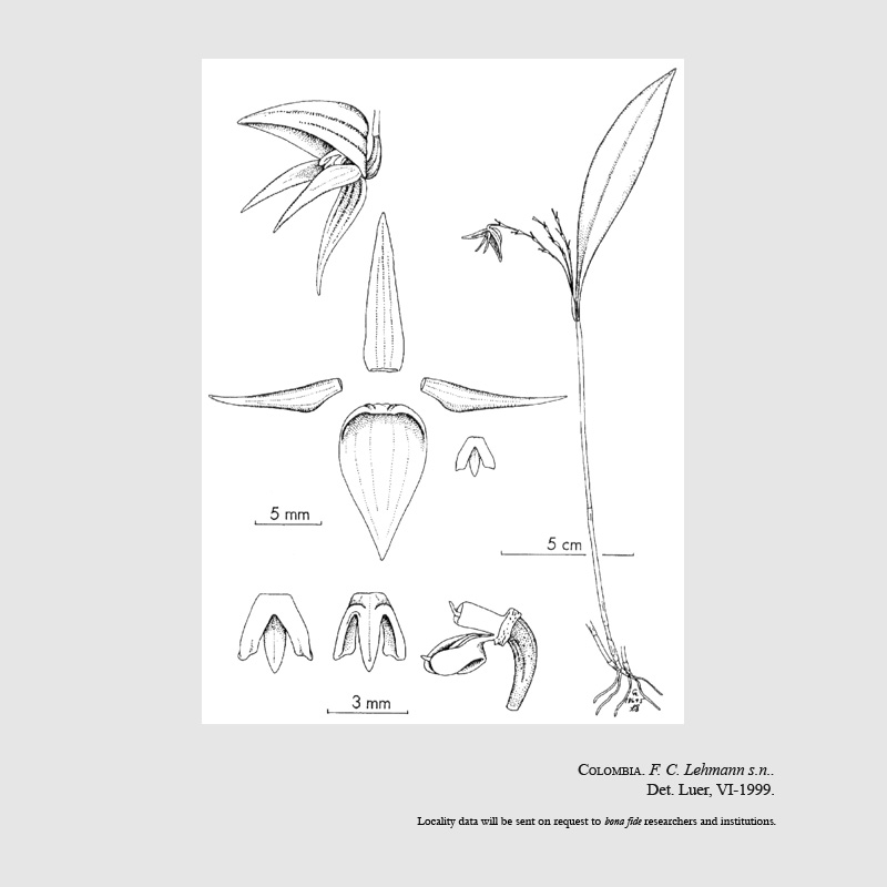 References W3 Tropicos, Kew Monocot list , IPNI ; *Orquideología Vol 21 #2 pg 132–134, Luer 1999 drawing; Icones Pleurothallidinarum Vol XVIII Systematics of Pleurothallis subsection Antenniferae, Longiracemosae, Macrophyllae-racemosae and Subgenera Pseudsostelis and Acuminata Luer 1999 drawing fide;