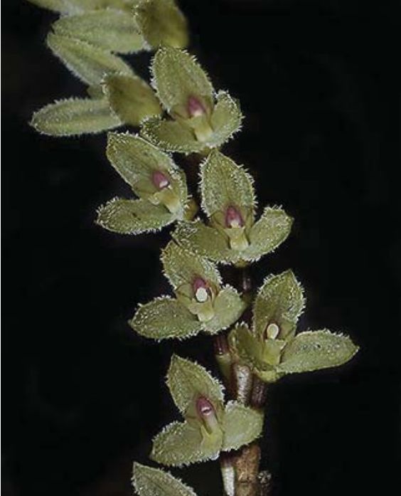 Found in La Paz department of Bolivia at elevations around 2450 meters as a mini-miniature to miniature sized, cold growing epiphyte with erect, slender ramicauls with a tubular sheath near the middle and 2 to 3 others at the base and carrying a single, apical, erect, thickly coriaceous, grey green, elliptical, subacute to obtuse, rounded and narrowly cuneate below into the petiolate base leaf that blooms in the summer on a subcongested, distichous, 4 to 5.6" [10 to 14 cm] long including the 1.2 to 1.6" [3 to 4 cm] long peduncle, simultaneously several flowered inflorescence arising through a spathe from an annulus below the apex of the ramicaul.