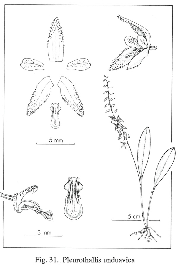References W3 Tropicos, Kew Monocot list , IPNI ; Icones Pleurothallidinarum Vol XVIII Systematics of Pleurothallis subsection Antenniferae, Longiracemosae, Macrophyllae-Racemosae and Subgenera Pseudsostelis and Acuminata Luer 1999 drawing fide; Orchids of Bolivia Vasquez & Ibisch Vol 1 2000 drawing fide; Icones Pleurothallidinarum Vol XXVI Luer 2004 Specklinia unduavica ; LANKESTERIANA 13(3): 319—332 Kerremans 2014 as Stelis unduvica; The Parque Nacional Carrasco, Cochabamba Bolivia, Orquideas del Proyecto Hidroelectrico Ivirizu Website 2021 as Stelis unduavica photo fide;