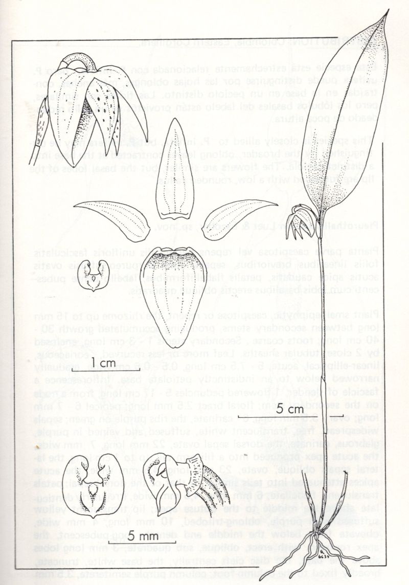 References W3 Tropicos, Kew Monocot list , IPNI ; *Orquideologia Vol 16 No 1 1983 drawing; Icones Pleurothallidinarum Vol III. Systematics of Pleurothallis Luer 1986; Native Colombian Orchids Vol 6 COS 1998 photo fide; Icones Pleurothallidinarum Vol XVIII Systematics of Pleurothallis subsection Antenniferae, Longiracemosae, Macrophyllae-Racemosae and Subgenera Pseudsostelis and Acuminata Luer 1999 drawing fide; AOS Bulletin Vol 74 No 10 2005 photo fide;
