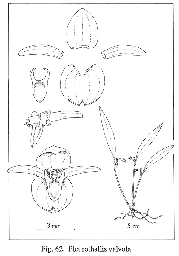 Pleurothallis valvola Luer & Hirtz 1988 SUBGENUS Pleurothallis SECTION Pleurothallis SUBSECTION Pleurothallis SERIES Pleurothalls Luer 1986 Drawing by © Carl Luer and The Swiss Orchid Foundation at the Jany Renz Herbaria Website