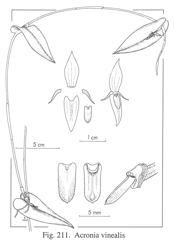 References W3 Tropicos, Kew Monocot list, IPNI ; *Orquideologia Vol 16 #3 1986 drawing fide; Icones Pleurothallidinarum Vol III Luer 1986; Icones Pleurothallidinarum Vol XXVII Luer 2005 as Acronia vinealis drawing fide