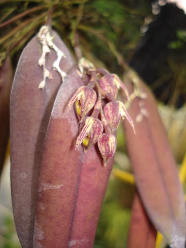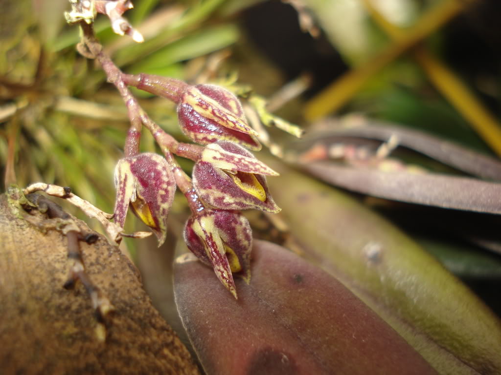 Found in southern Mexico, Guatemala and El Salvador in montane rainforests and elfin forests at elevations of 950 to 1500 meters as a miniature to small sized, warm to cool growing epiphyte with erect, slender, terete, 2 internoded ramicauls enveloped partially by tubular, obtuse, imbricate sheaths and carrying a single, apical, erect, lanceolate to elliptic-lanceolate, acute and tridenticualte apically, sessile, abaxially tinged with purple leaf that blooms in the winter and early spring on a terminal, 1 to 3 per stem, racemose, .8 to 1.2" [2 to 3 cm] long, congested, 4 to 6 flowered inflorescence