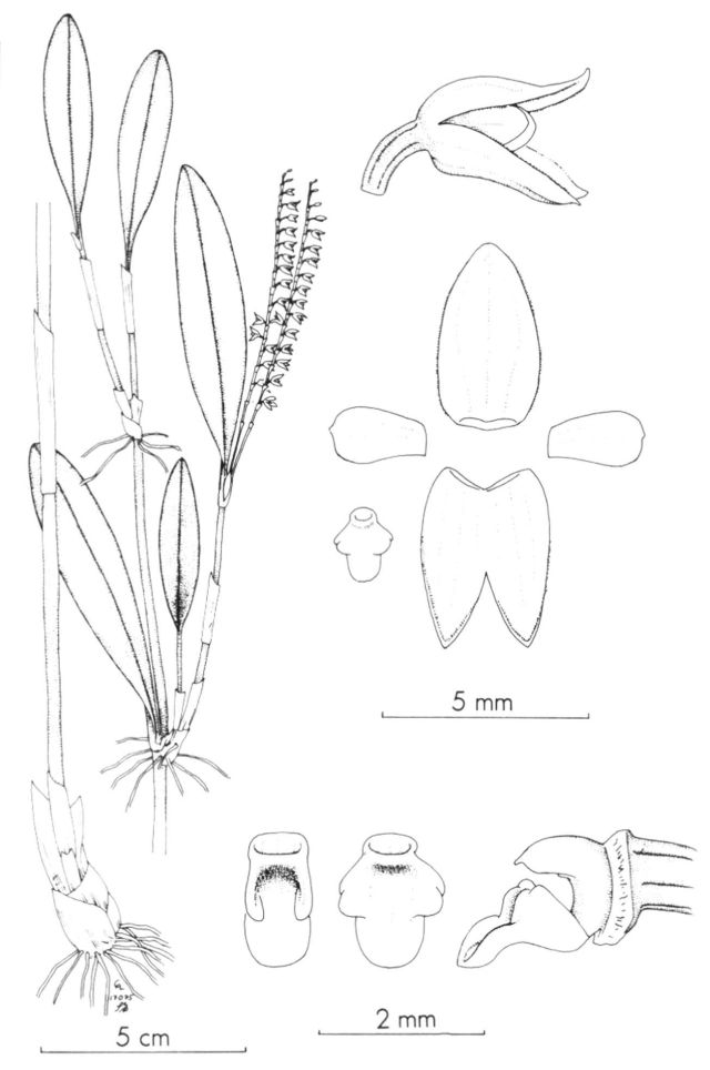 Found in Peru in wet montane forests at elevations around 1800 to 3500 meters as a small sized, cool to cold growing terrestrial with fasciculate, superposed, stout to slender ramicauls enveloped by a long tubular sheath near the middle and several, imbricating sheaths at the base and carrying a single, apical, erect, coriaceous, elliptical-oblong, subacute to obtuse, cuneate below into the petiolate base leaf that blooms in the spring, summer and fall on 1 to 3, simultaneous slender, more or less secund, 2.8 to 6" [7 to 15 cm] long, densely and simultaneously many flowered inflorecence arising through a spathe with an annulus below the abscission layer with infundibular, imbricating floral bracts