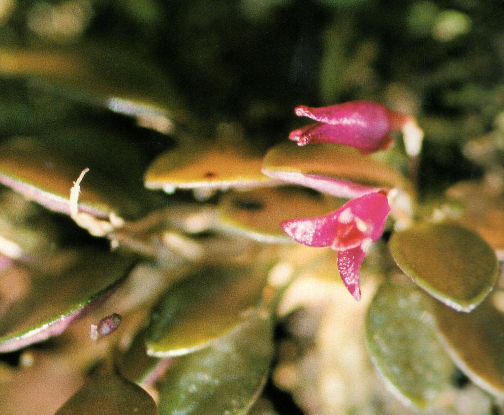 Found in eastern Cuba in humid and shady places in montane rainforests, mesophyllous evergreen rainforests, gallery forests and charrascales from 300 to 900 meters as a hot to warm growing epiphyte with very short, ascending ramicauls enveloped completely by 3, membraneous, tubular sheaths and carrying a single, apical, erect, ellipticto obovate to suborbicular, obtuse to rounded, minutely tridentate, green to greenish purple, shortly attenuate into the petiolate base leaf that blooms in the winter and spring on 1 to 3, terminal, capilar, erect, glabrous, .1 to .15" [2 to 3 mm] long, generally single flowered inflorescence arising through a tubular sheath with an annulus.