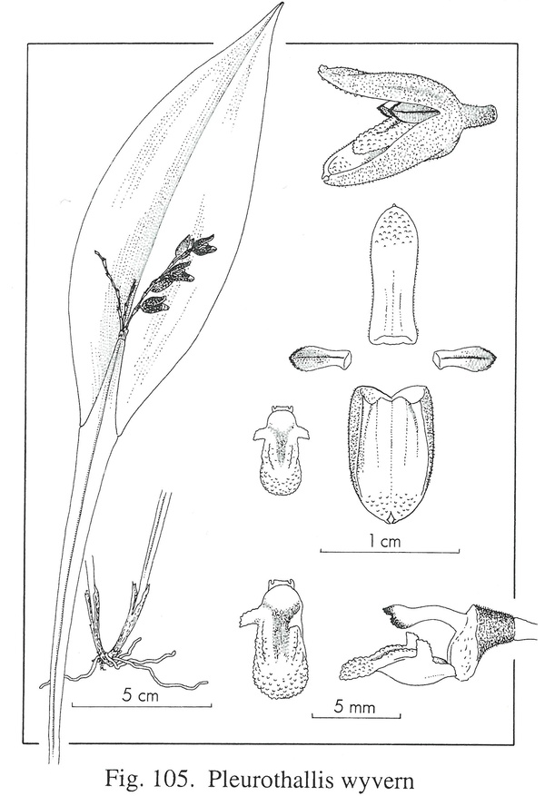 Pleurothallis wyvern Luer & R.Escobar 1981 SUBGENUS Acianthera SECTION Brachystachyae Lindley 1859 TYPE Drawing by © Carl Luer and The Swiss Orchid Foundation at the Jany Renz Herbaria Website