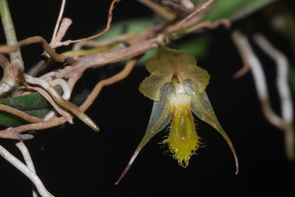 Found in Boyaca department of Colombia in scrub cloud forests at elevations around 3200 meters mini-miniature sized, prolific, cold growing epiphyte with an elongate, creeping rhizome giving rise to erect ramicauls enveloped by 2 to 3 basal sheaths and carrying a single, apical, erect, narrowly elliptic, obtuse, gradually narrowing below into the petiolate base leaf that blooms in the spring on an erect, 1" [2.5 cm] long, single flowered inflorescence.