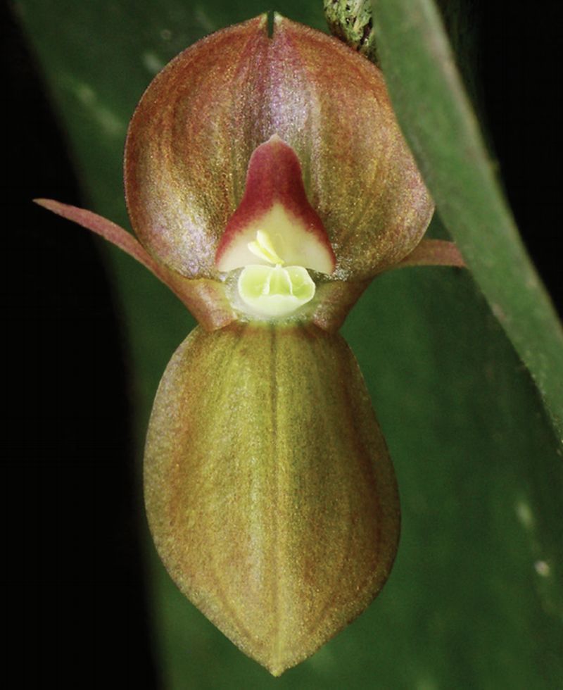 "The relatively large plants with narrowly ovate-lanceolate leaves, cordate at the base, and the large, truly pendent, partially reflexed, nonresupinate flowers with bronze sepals and red petals, provided with a white lip flushed bright red toward the apex and the margins, are diagnostic of Pleuothallis × subversa." Pupulin etal 2021
