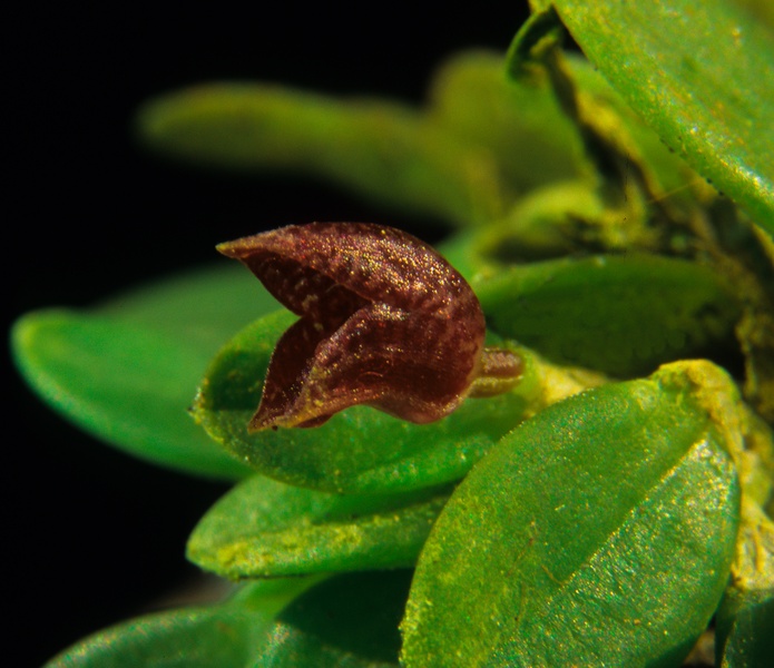 Found in Santa Cruz Bolivia at elevations of 1900 to 2500 meters as a repent, mini-miniature sized, cool to cold growing lithophyte with a stout rhizome adpressed to the substrate giving rise to a prostrate, thickly coriaceous, smooth, suffused with dark purple, broadly elliptical, narrowing below into the subpetiolate base leaf that blooms in the late spring and summer on a successively single flowered inflorescence