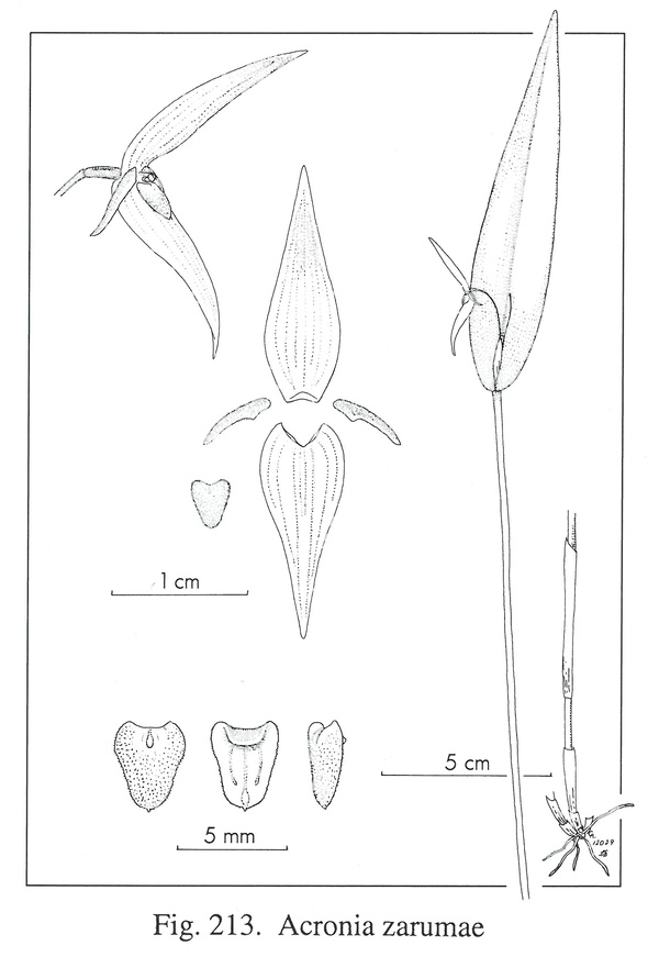 References W3 Tropicos, Kew Monocot list , IPNI ; Native Ecuadorian Orchids Vol 4 Dodson 2003 drawing fide; Icones Pleurothallidinarum Vol XXVII Luer 2005 as Acronia zarumae drawing fide