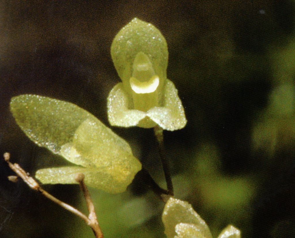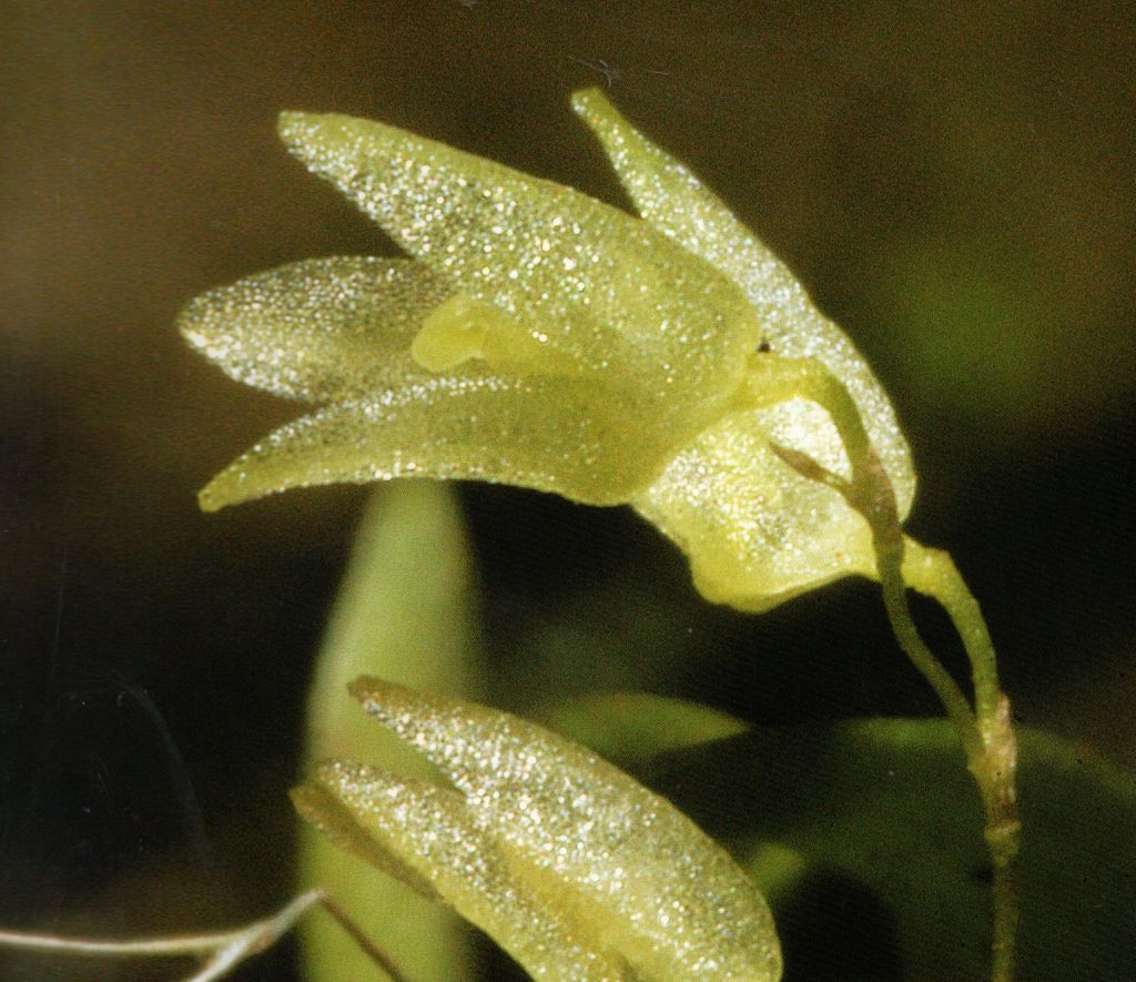Found in eastern Cuba, Haiti and the Dominican Republic in humid places in montane rainforests and charrascales from 300 to 800 meters as a mini-miniature sized, hot to cool growing epiphyte with very short, erect to ascending ramicauls enveloped by 3, scarious, tubular to infundibuliform sheaths and carrying a single, apical, erect, coriaceous, spathulate to oblanceolate, obtuse, minutely tridentate, glabrous, entire to minutely crenulate, attenuate below into the petiolate base leaf that blooms on a [rarely 2] terminal, erect, capillary, .2" to .75" [.5 to 1.8 cm] long, 3 to rarely 5 flowered inflorescence arising through an ovate sheath with an annulus with simultaneously opeing flowers.