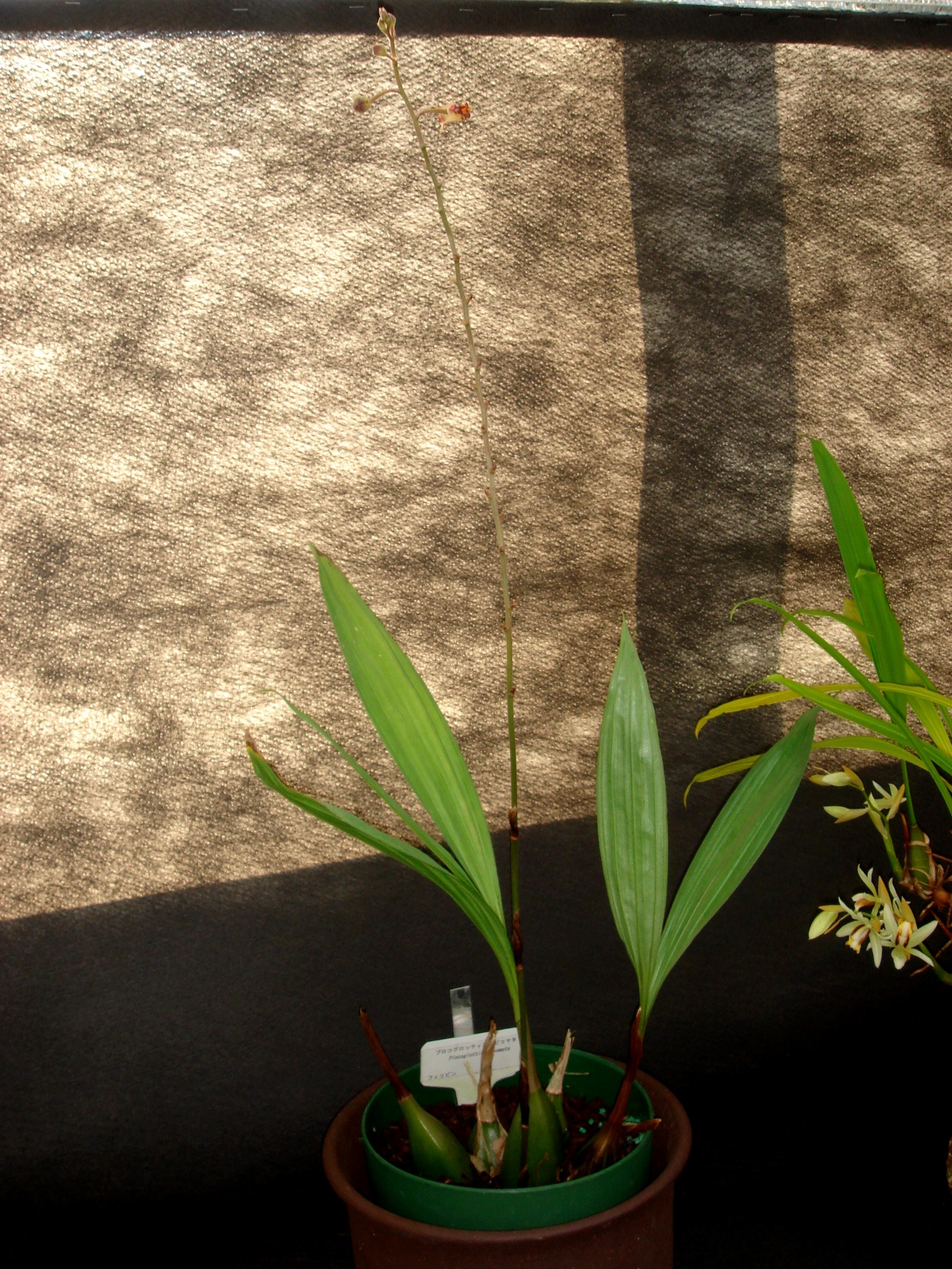 Found in the Philippines at elevations around 1300 meters as a medium sized, cool growing terrestrial with large pseudobulbs carrying 4, apical, lanceolate, acuminate, plicate, distincly 3 veined, gradually narrowing below into the elongate petiolate base leaves that are sheathed basally by brown scarious sheaths and blooms on a lateral from the base, erect, shortly hairy, to 8" [20 cm] long, loosely one to successively few flowered inflorescence with triangular, lanceolate, acuminate, hairy bracts.
