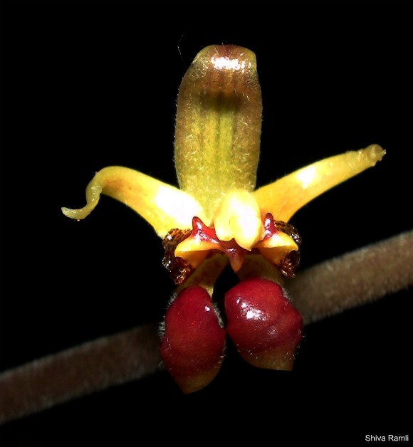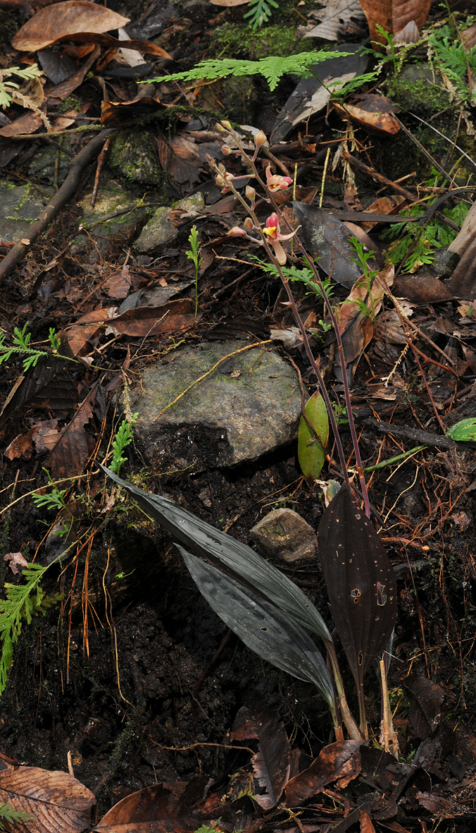 Found in Thailand, Borneo, Sumatra, Malaysia and New Guinea in heath, lowland, and hill forests at elevations of sea-level to 1000 meters as a medium sized, hot to warm growing terrestrial with conical, olive, purple pseudobulbs carrying a single, apical, erect, lanceolate, acute, plicate, shiny greenish purple above, bright red purple beneath, narrowing basally into the petiolate base leaf that blooms in the winter and spring on an erect, 28" [to 70 cm] long, pubescent, successively single, to 20 flowered indflorescence with lanceolate, acuminate floral bracts. These flowers have a moveable lip that triggers and shuts tight when something touches it.