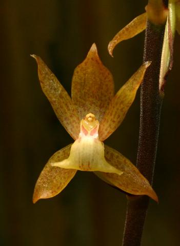 Found in Java, Borneo, Sumatra, Sulawesi, Moluccas, Laos? and the Philippines as a medium-sized, hot to warm growing terrestrial at elevations around 300 to 1200 meters in lowland and mixed montane rainforests in deep shade in alluvial soils with sandstone, limestone and shales in dense shade with cylindrical, several noded pseudobulbs carrying a single, apical, erect, elliptic to ovate, acuminate, longly petiolate leaf that blooms in the summer on an erect, laerally from the nodes on the lower part of the pseudobulb, laxly few to many flowered, 18" [50 cm] long, pubescent, racemose, terete inflorescence with acuminate, lanceoelate bracts and successively opening flowers.