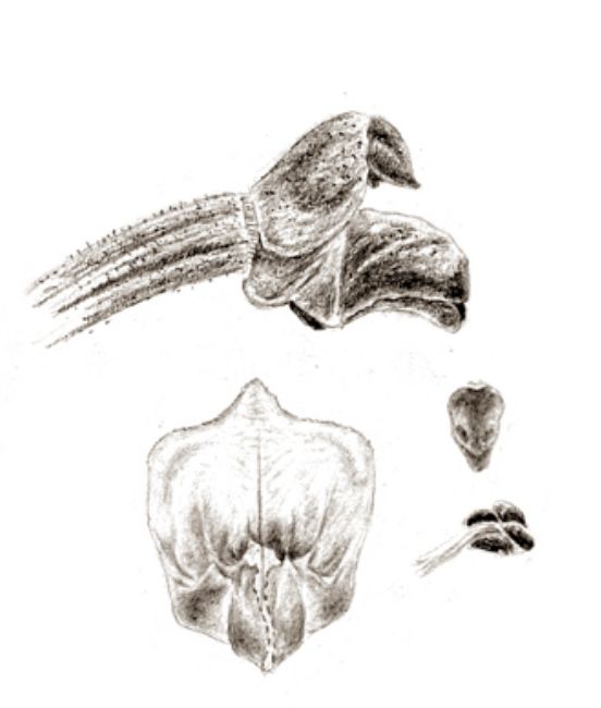 Found in New Guinea in lowland forests at elevations around 40 meters as a large sized, hot growing terrestrial with an elongate pseudobulb stem enveloped basally by decaying sheaths and carrying 7, elongate-lanceolate, acute-acuminate, 5 prominent veined beneath, plicate, cuneate below into the tubular leaf sheaths that blooms in the spring on an erect, robust, elongate, rachis thick, obtusely angular, densely velutinous-pubescent, laxly many flowered inflorescence with persistent, stronhgly patent, ovate-triangular, basally concave, otherwise convex, sptrongly acuminate, pubescent floral bracts and carrying fleshy, dorsally pubescent flwoers without color data.