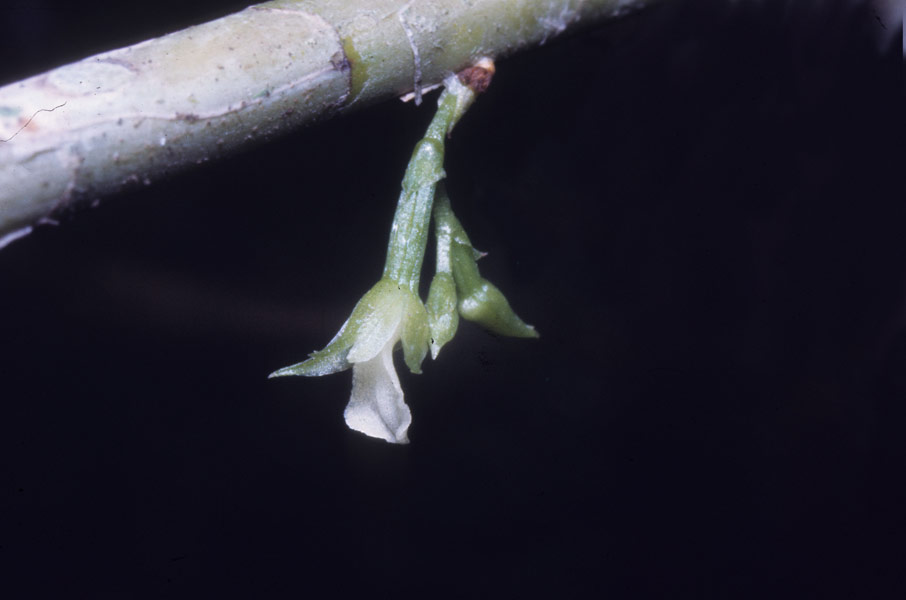 Found in Thailand, penninsular Malaysia, Java, Sumatra, Sabah Borneo and the Philippines in lowlands and hill riverine forests at elevations around 400 to 600 meters as a medium sized sized, hot to warm growing epiphyte with hard, non-branched stems carrying in youth 2 ranked, linear, gradually narrowing apically to an obtuse bilobed apex leaves that blooms in the late summer and early fall on numerous, lateral, very short to .4" [1 cm] long, successively, 2 to 4 flowered inflorescence with triangular floral bracts
