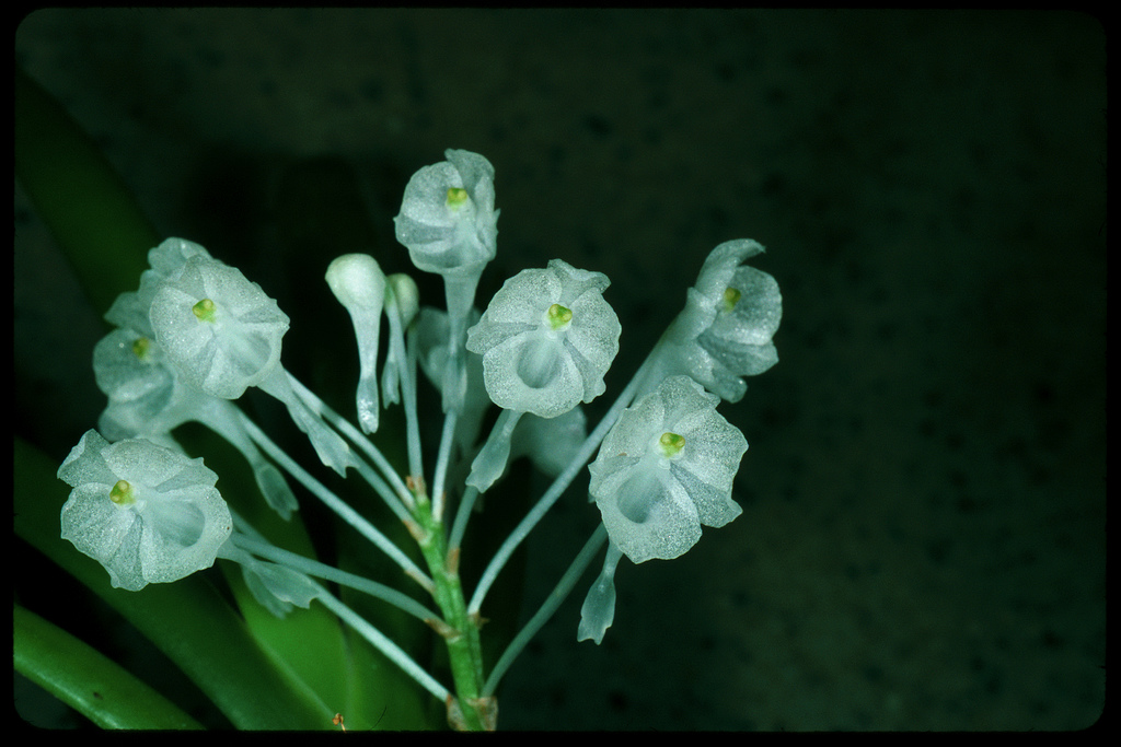 A mini-fan equitant from Angola, Cameroon, Ghana, Guinea, Ivory Coast, Nigeria, Sierra Leone, Tanzania, Uganda and Zaire with glasslike flowers that likes hot to warm temps and is found in evergreen rainforests often near waterfalls or rivers at altitudes of 750 to 1950 meters as a small sized, hot to warm growing epiphyte and occasional lithophyte with a short stem enveloped completely by conduplicate leaf bases carrying 4 to 8 distichous, falcate, bilaterally compressed, acute, fleshy leaves that blooms on a axillary, 2" [5 cm] long, several [5 to 20] flowered, subumbellate inflorescence that are shorter than the leaves with simultaneously opening, longlasting flowers all occuring in the spring through fall. Best grown in a pot with a coarse mix to provide excellent drainage, hot to warm, humid, semi-shaded conditions and a definite drying out between waterings.