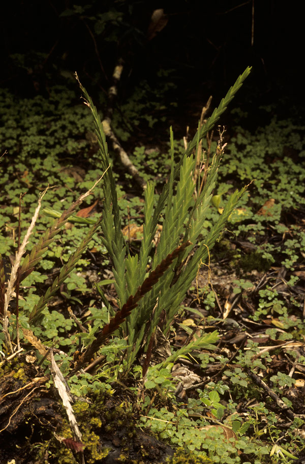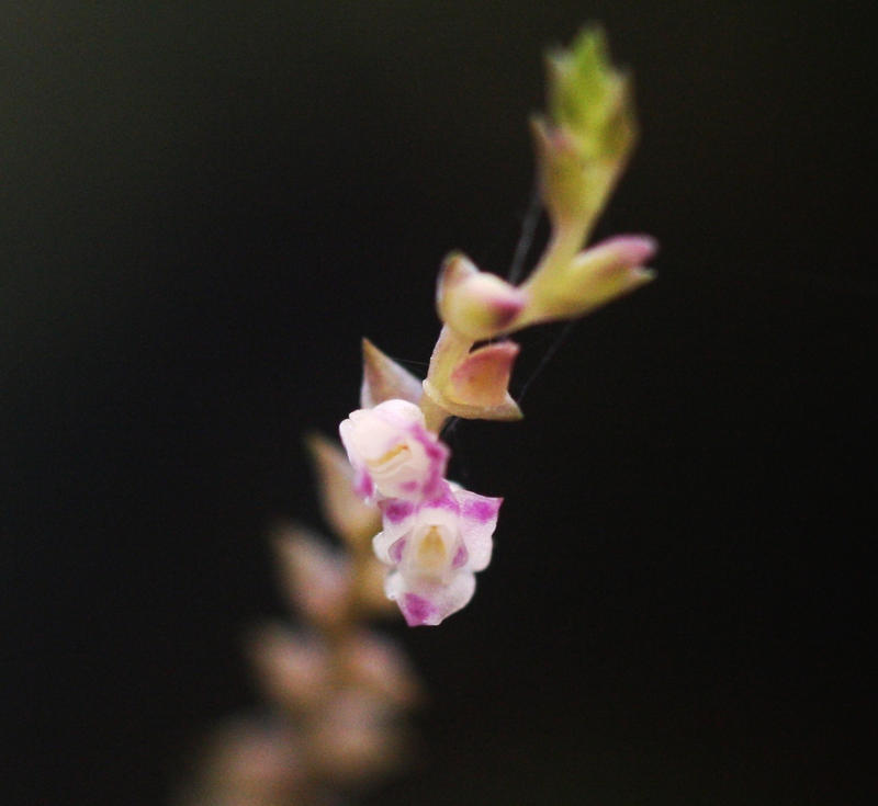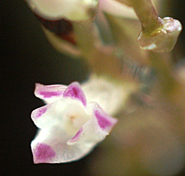 Found in India and Sri Lanka in submontane and tropical wet evergreen forests at elevations of 600 to 1850 meters as a miniature to small sized, warm to cool growing epiphyte or terrestrial with a slender, nonpseudobulbous stem carrying distichous, equitant, laterally compressed, subulate to ovate-subulate, acute, subacute to obtuse, straight, erect, basally clasping leaves that blooms in the late spring, summer and earlier fall on a terminal, peduncle .02 " [5 mm] long, 1.4" [3.5 cm] long overall, few flowered inflorescence with ovate, acuminate, acute, basally cordate, persistent, minutely and sparsely spiny, 3 veined floral bracts.