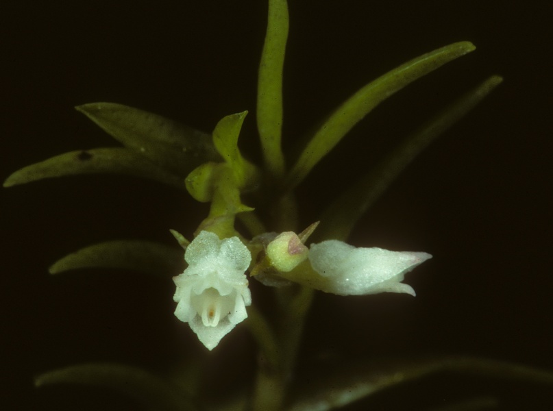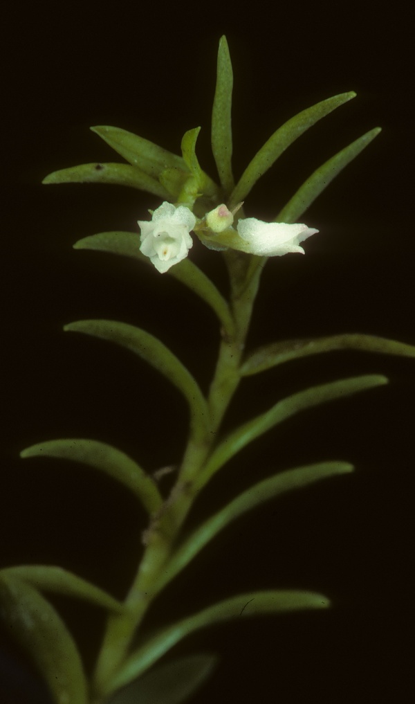 Found in Guangdong, southwestern Guangxi, Hainan and southern Yunnan provinces of China, the eastern Himalayas, Assam, Bangladesh and Vietnam in forests along streams on trees at elevations of 400 to 1900 meters as a miniature to small sized, hot to cool growing epiphyte with subterete, tufted, ascending, leafy stems enveloped completely by sheaths and carrying many, distichous, slightly dark brown when dried, narrowly oblong to narrowly oblong-lanceolate, often more or less falcate, somewhat fleshy, articulate, incurved margins, acuminate to acute apically, narrowing below into the amplexicaul, tubular base leaves that blooms in the summer on a terminal or lateral; ,[3 to 5 mm] long, 2 to 4 flowered inflorescence with ovate-lanceolate, 3 to 5 veined floral bracts.