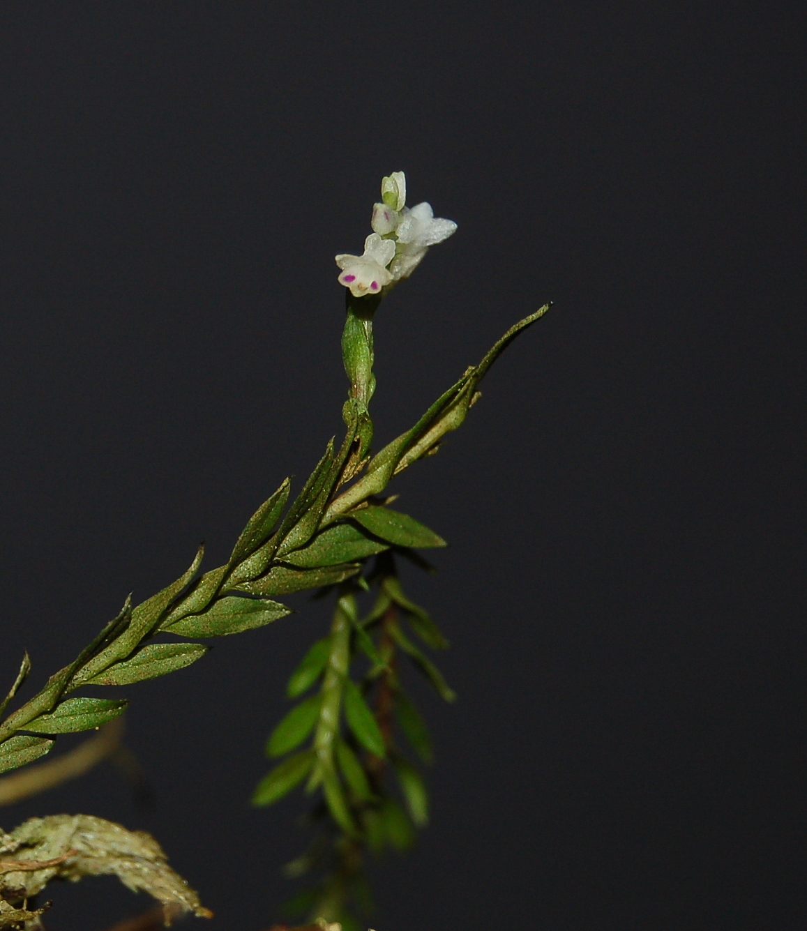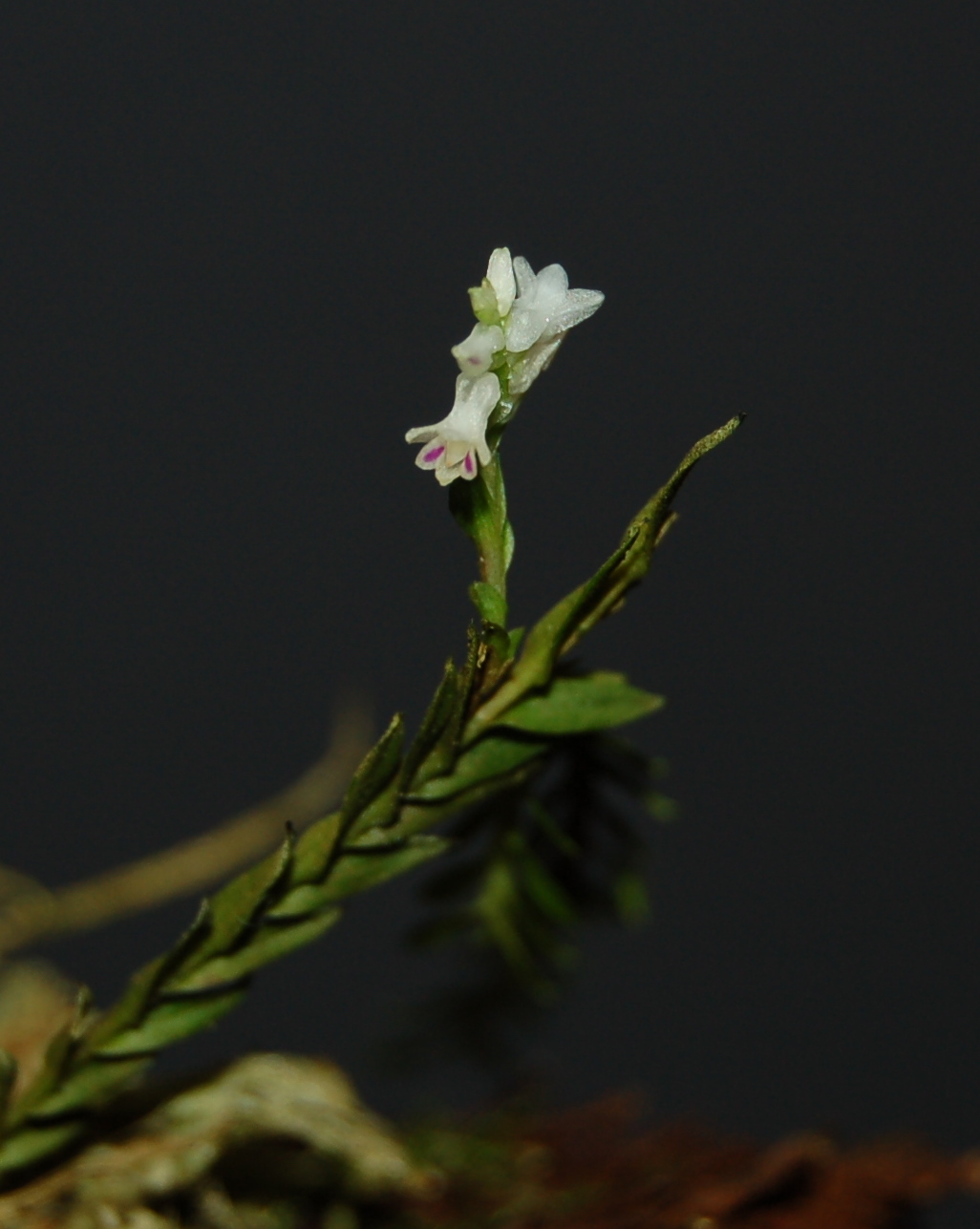 Found in New Guinea in lowland forests at elevations around 30 to 1250 meters as a small sized, hot to cool growing epiphyte with filiform, glabrous, terete, densely leafy stems enveloped completely by tightly clasping leaf bearing sheaths and carrying erect-patent, oblong-ligulate to lanceolate-ligulate, glabrous, oblique, long apiculate apically, cuneate below leaves that blooms in the late spring and summer on a terminal to subterminal, erect to pendant, .2" [5mm] long, 2 to 4 flowered inflorescence with patent, glabrous flowers