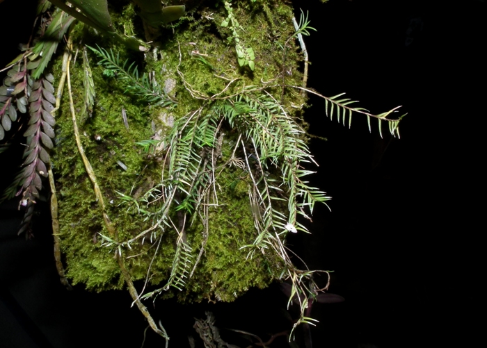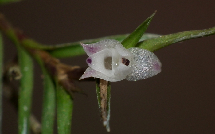 Found in the Philippines in shady locations at elevations of 80 to 960 meters as a small sized, hot to warm growing epiphyte with very slender, branching stems carrying 2 ranked, linear, that blooms in the winter and spring on a short, from the axils of the leaves near the tips of the stem, single flowered inflorescnece
