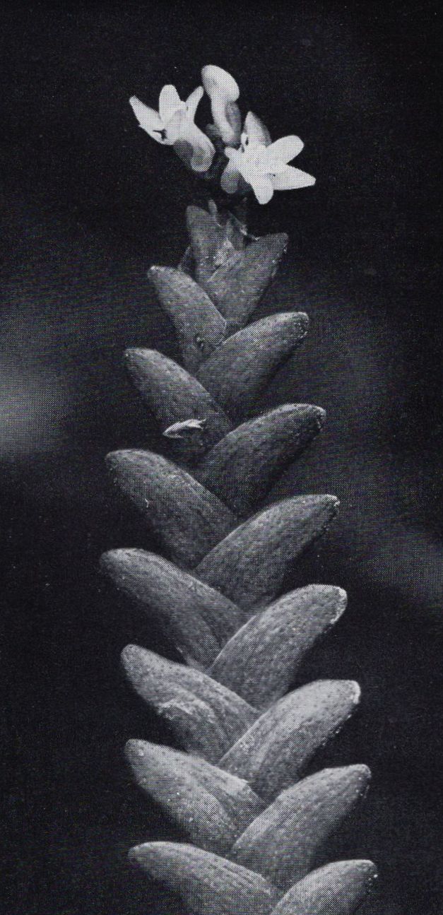 Found in Sri Lanka in tropical wet evergreen forests at eelvations up tp 1000 meters as a small sized, hot to warm growing epiphyte with lateral to pendent, nonpseudobulbous stems enveloped completely by basally imbricating, clasping leaf sheaths and carrying many 2 ranked, laterally compressed, lanceolate, slightly recurved, obtuse leaves that blooms in the fall, winter and early spring on a terminal, 2.8" [7 cm] long, few flowered inflorescence with ovate, acuminate, 3 veined floral bracts