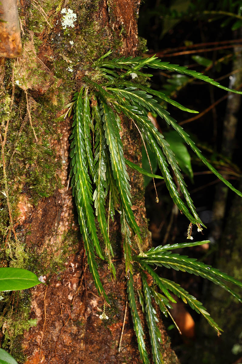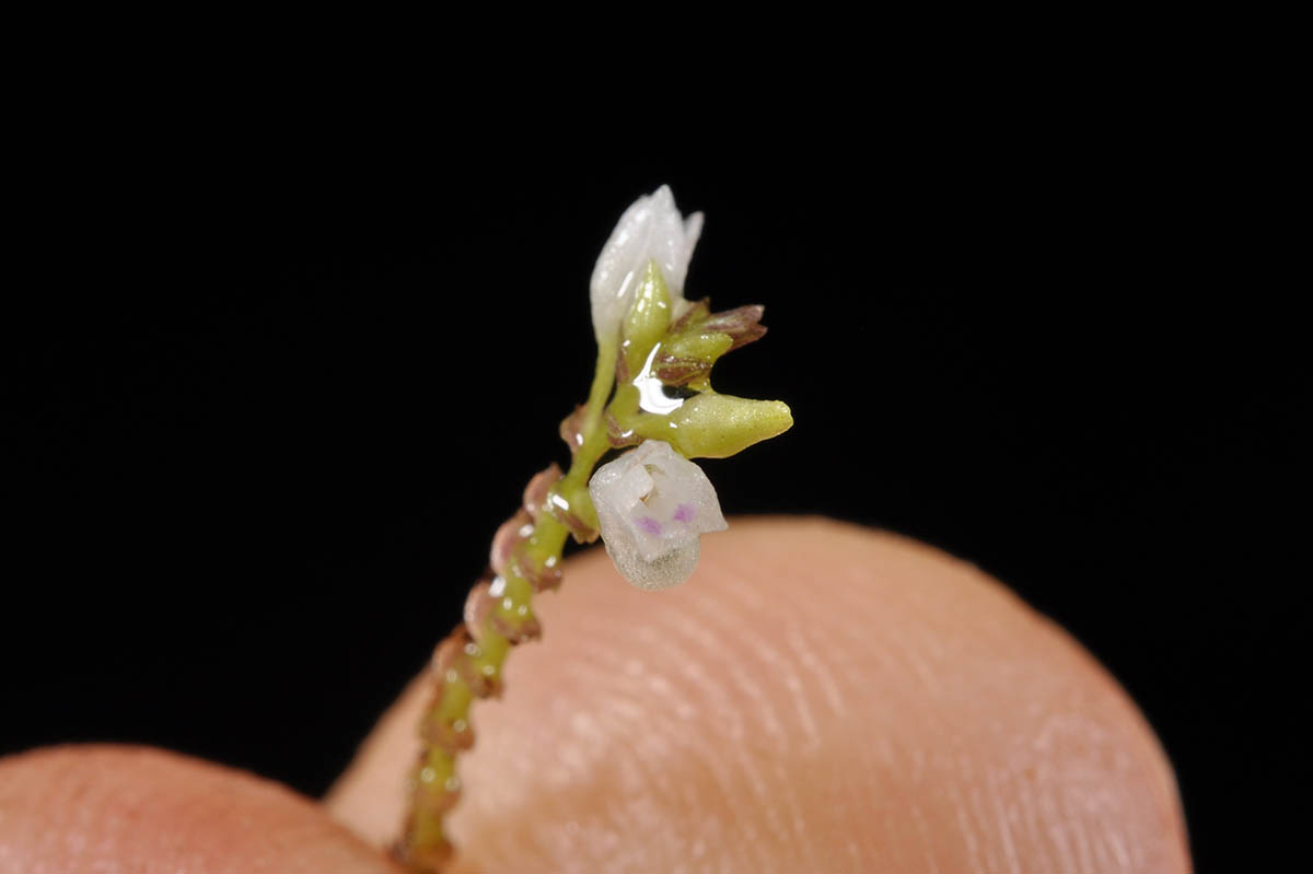 Found in the Philippines in shady locations at elevations of 1000 to 1500 meters as a miniature to small sized, cool growing epiphyte with stiff, not branching stems carrying 2 ranked, shiny green, narrowly ovate, acute leaves that blooms in the late winter, spring and summer on a terminal, short, 2 ranked, successively many, 2 to 3 at a time inflorescence