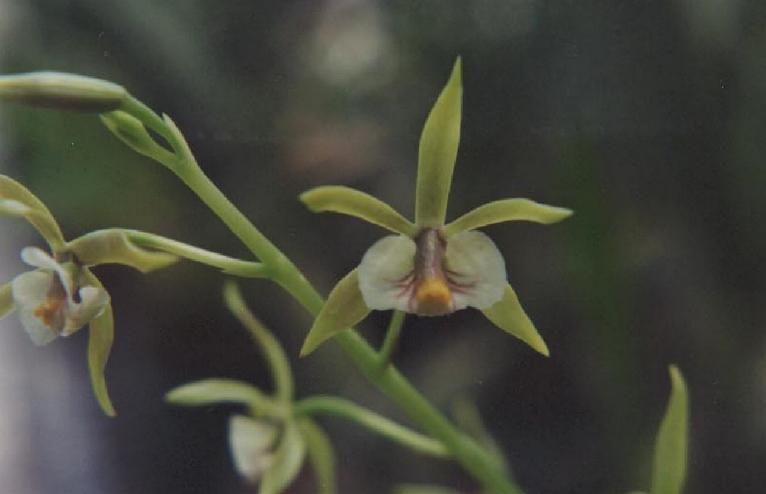A medium sized, warm to cold growing epiphyte and sometimes lithophyte, that is endemic to the wooded slopes of western Mexico in oak trees at elevations of 550 to 2200 meters with widely spaced, stalked, ovoid, somewhat flattened pseudobulbs partially enveloped basally by 2, scarious sheaths and carrying 2 to 3, apical, narrowly linear, acute, conduplicate below and basally clasping leaves that blooms variably throughout the year on an apical, 6" [16 cm] long, erect, racemose inflorescence arising on a mature pseudobulb as a new one develops, with basal, scarious, triangular sheaths, and is the length of the leaves or less and carrying 4 to 12, small, simultaneously opening flowers.