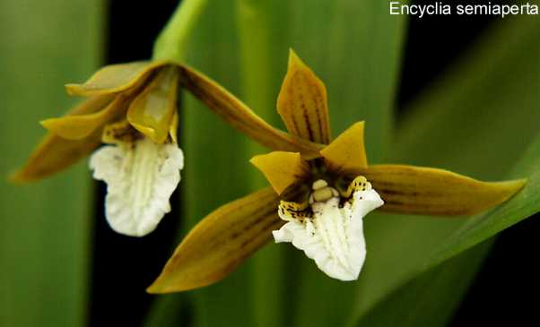 There are up to 10 small, partialy open, successively opening, resupinate flowers and is similar to Encyclia livida save the partially open flowers, a lip that is as wide between the lateral lobes[when spread] as across the midlobe, the lateral lobes clasp the column and the bifoliate pseudobulbs.