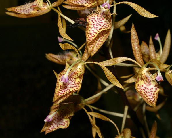 Found in Ecuador on the eastern slopes of the Andes in dense and very wet forests most often on trunks at elevations of 1500 to 2000 meters as a medium sized, warm to cool growing epiphyte with an elliptic, plicate, petiolate leaf that blooms in the late spring through summer on a basal, pendant, densely brown hispid, 7.2 to 14" [18 to 35 cm] long, 7 to 20 flowered inflroescence with 4 to 5 papery, ovate-elliptic, acute bracts.