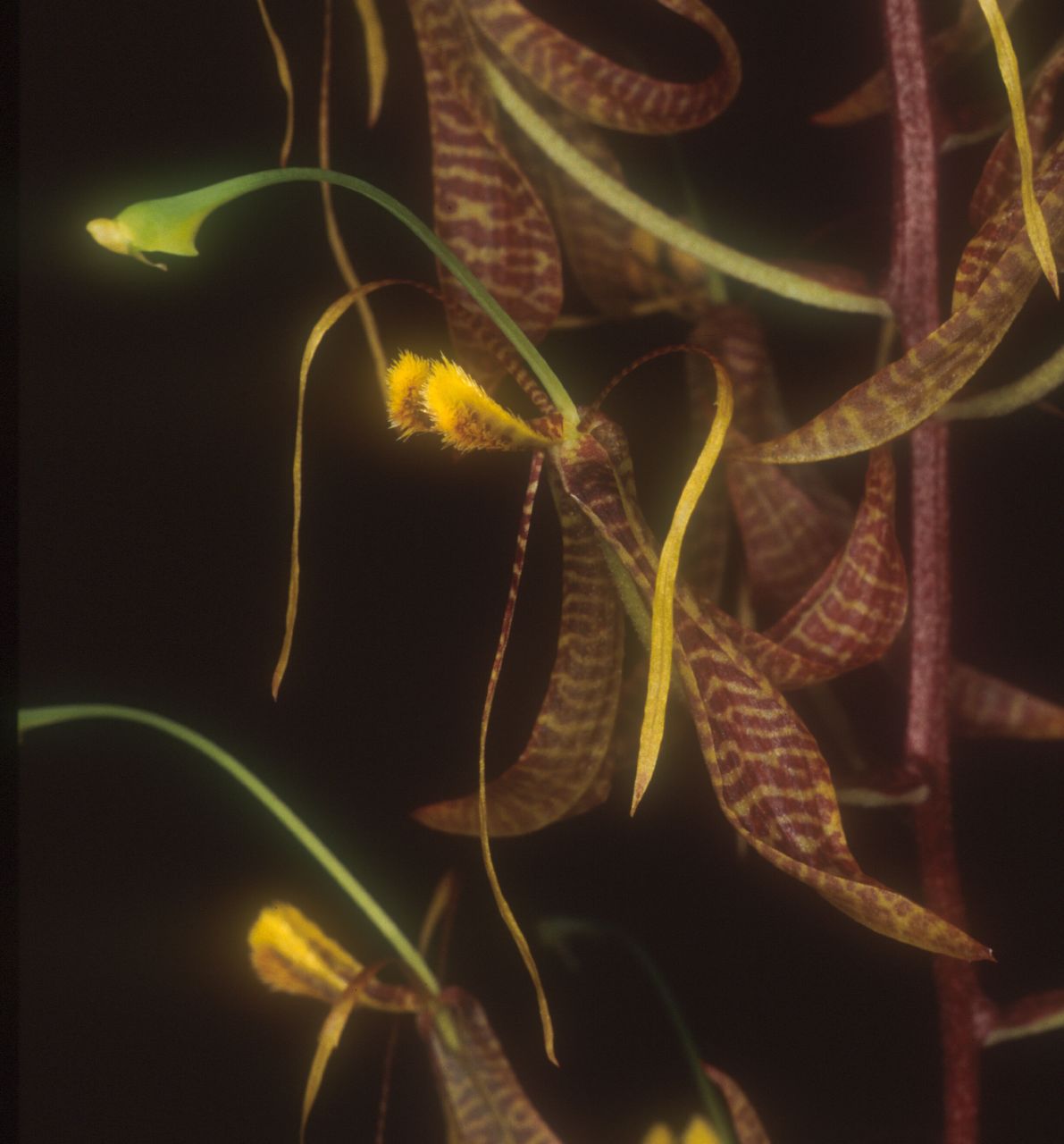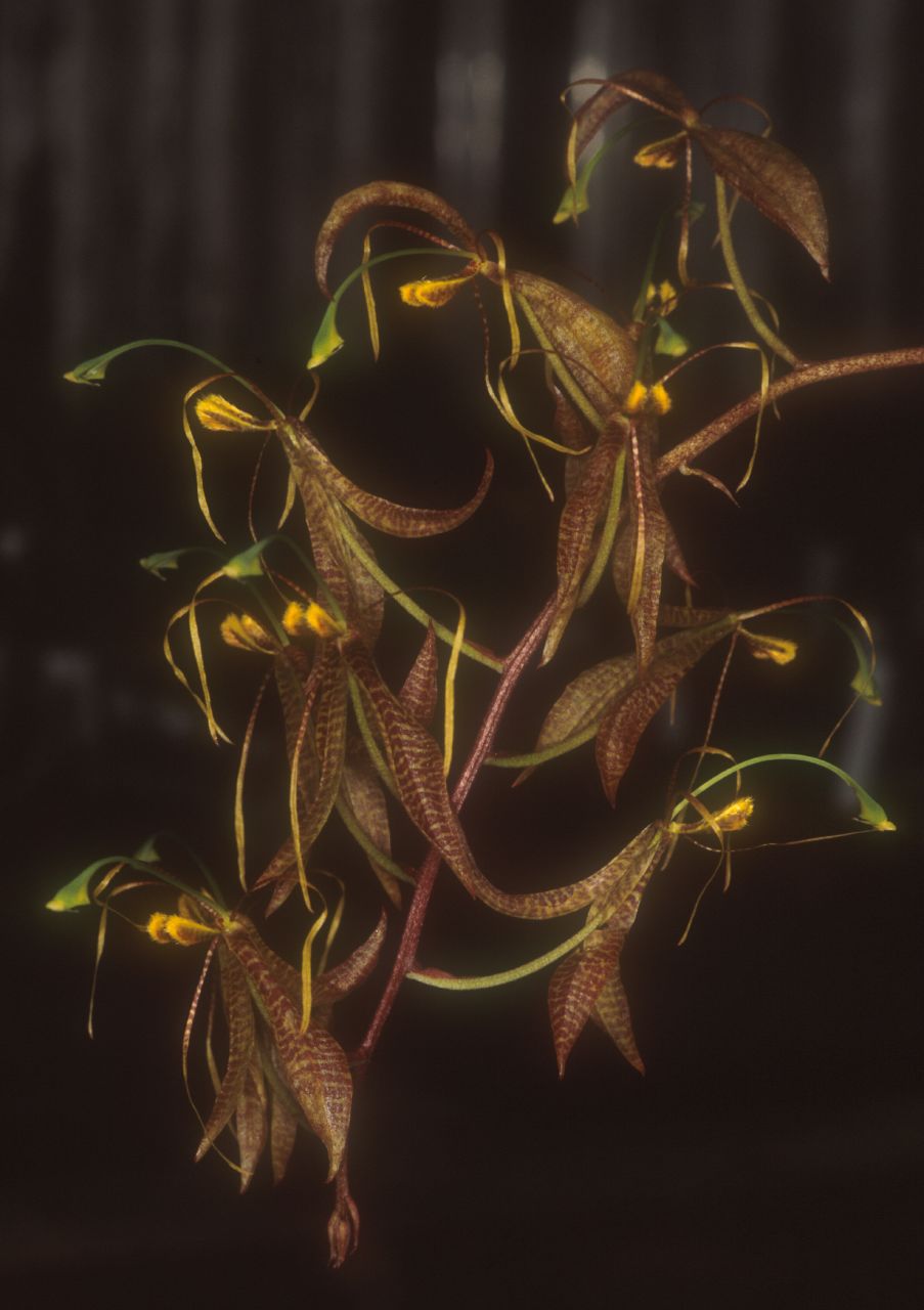 Found in El Choco Colombia and Ecuador in lowland montane forests at elevations of 100 to 1150 meters as a small medium sized, hot to warm growing epiphyte with small ovoid, quadrangular psueodubos carrying 1 to 2, apical, plicate, elliptic,shortly acuminate leaves that blooms on a basal, pendant, darkly hispid, 16" [40 cm] long, many [20] flowered inflorescence with 4 perfoliate, acute, pilose, clasping bracts and lanceolate floral bracts..
