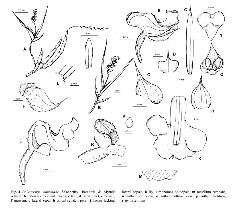 References W3 Tropicos, Kew Monocot list , IPNI ; *Pl. Syst. Evol. 300: 22 Szlach., Baranow & Mytnik 2013 A phylogenetic and morphological study of Polystachya sect. Superpositae (Orchidaceae) with description of a new species from Cameroon; Orchidaceae of West Central Africa Vol 2 Szlachetko etal 2015 drawing fide;