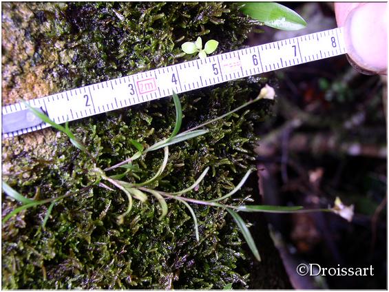 Found in Gabon in primary and secondary forests at elevations of 100 to 600 meters as a mini-miniature sized, hot to warm growing epiphyte with delicate, fusiform pseudobulbs enveloped by 1 to 2 basal sheaths and carrying 3 to 4, apical, linear-oblanceoalte, unequally tridentate, acute teethj, middle one the longest, erect to suberect leaves that blooms in the spring and fall on an erect, to 1.8" [4.5 cm] long, dense, filiform, delicate, glabrous, to 10 flowered inflorescence with ovate, acuminate, thin, delicate, glabrousfloral bracts