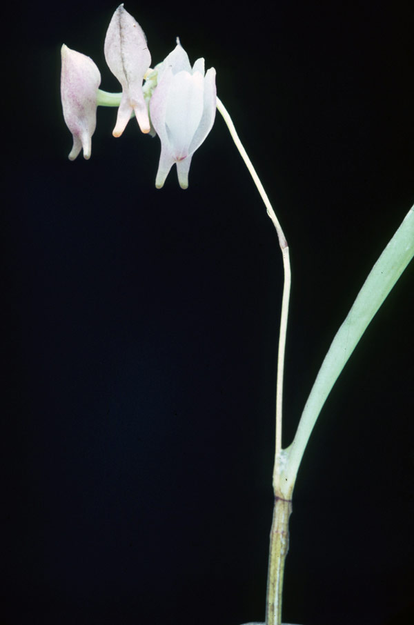 Found in Nigeria, the Gulf of Guinea Islands and Cameroon in submontane and montane forests at elevations of 950 to 2100 meters as a mini-miniature to small sized, cool to cold growing epiphyte with narrowly cylindrical pseudobulbs enveloped by 2 to 3 membraneous sheaths and carrying a single, linear to lanceolate, acute to subacute, sometimes obtuse, fleshy, thick, cuneate below into the articulate base leaf that blooms in the spring, summer and fall on an erect, 2 to 3 branched, 1 to 4.8" [2.5 to 12 cm] long, shorter than the leaf, glabrous, successively few, several flowered inflorescence with ovate-lanceolate to triangular, amplexicaul, acuminate, glabrous floral bracts and carrying medium sized, non-resupinate flowers .