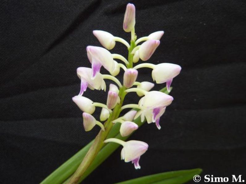 Found in Nigeria, Cameroon, Equatorial Guinea, The Gulf of Guinea Islands, Gabon, Zaire and Rwanda in submontane, montane, marshy and Bamboo forests at elevations of 700 to 2500 meters as a medium sized, warm to cold growing epiphyte with slender, narrowly cylindrical pseudobulbs carrying 7 to 11, linear to linear-lanceolate, widest at the base, unequally bilobed apically, lobes subobtuse leaves that blooms at most any time of the year on an erect, dense, simple, glabrous, 4 to 8" [10 to 20 cm] long, 10 to 30 flowered inflorescence with triangular-ovate, acute glabrous floral bracts and carrying non-resupinate flowers.