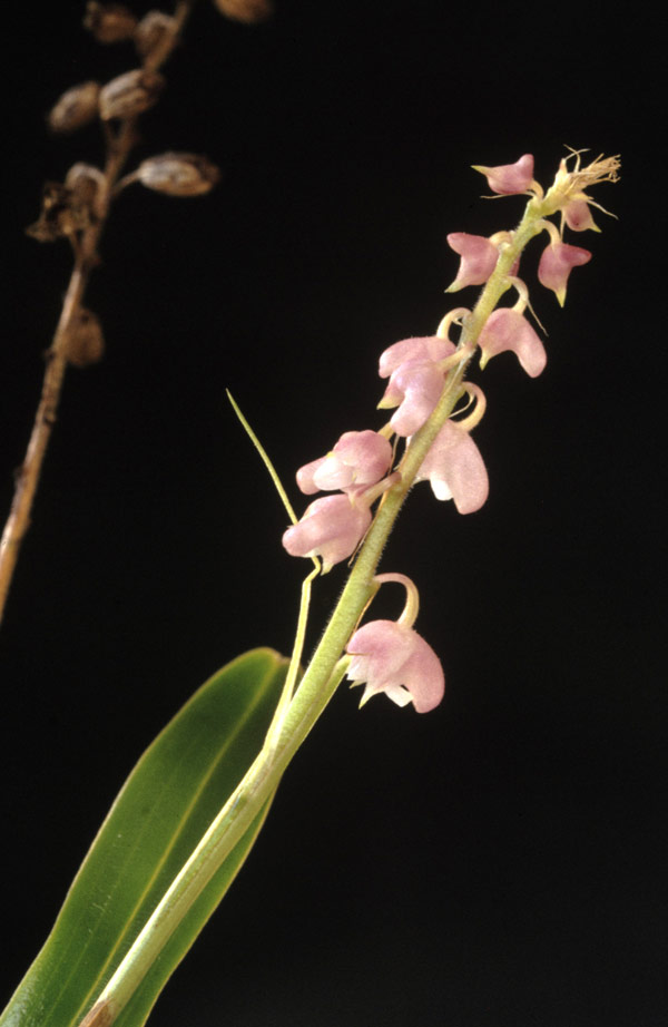Found in Sao Tome in the Gulf of Guinea islands in evergreen forests and avocado plantations at elevations of 1050 to 1200 meters as a mini-miniature to miniature sized, cool growing epiphyte with clustered, ovoid pseudobulbs carrying 2, ligulate-linear, shortly bilobed at the rounded apex, articulate below into the canaliculate basal sheath leaves that blooms in the spring and again in the fall on an erect, peduncle 1.6 to 4.2" [4 to 10.5 cm] long, enveloped by imbricate, conduplicate, acute sheaths, 2 to 6" [5 to 15 cm] long, over all, racemose, subdensely 15 to 40 flowered inflorescence carrying nutant flowers.