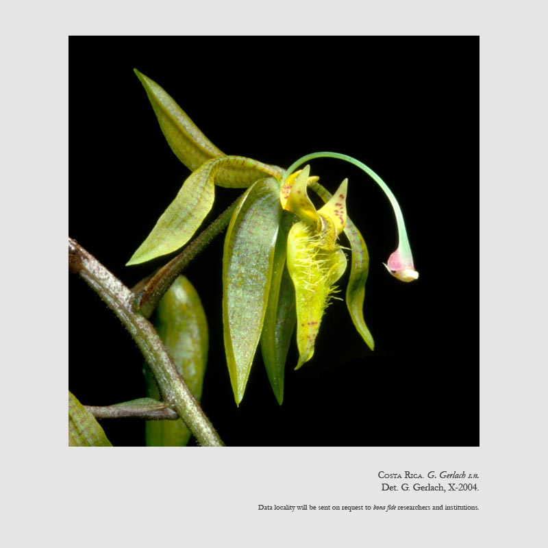 References W3 Tropicos, Kew Monocot list , IPNI ; *Lankesteriana 4(1): 67. Gerlach 2004 drawing/photo; AOS Bulletin Vol 86 #8 2017 photo fide; Vanishing Beauty, Native Costa Rican Orchids Vol 2 Lacaena to Pteroglossa Pupulin 2020 photo fide