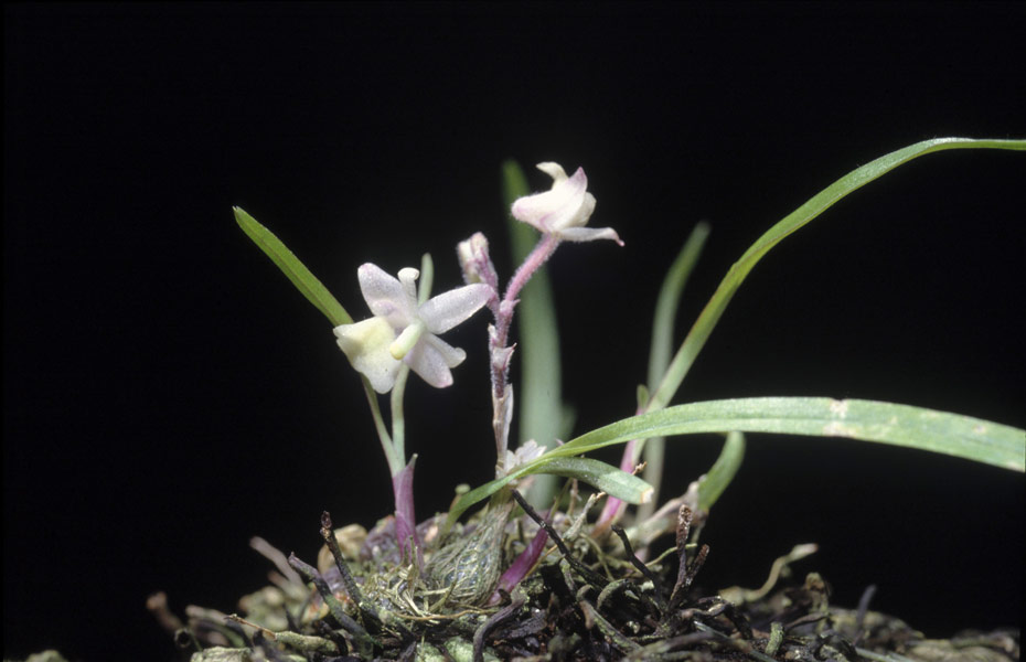 Found in Zaire, Malawi and Zambia in brachystegia forests on lichen covered trees at elevations around 1100 to 2000 meters as a mini-miniature sized, cool growing terrestrial that forms dense mats and has clustered, globose to ovoid, dark green to purplish pseudobulbs carrying 2 apical, linear, grass-likedeciduous in the dry season leaves that blooms in the winter on an erect, .8 to 2" [2 to 5 cm] long, 1 to 5 flowered inflorescence carrying fragrant [primrose] flowers