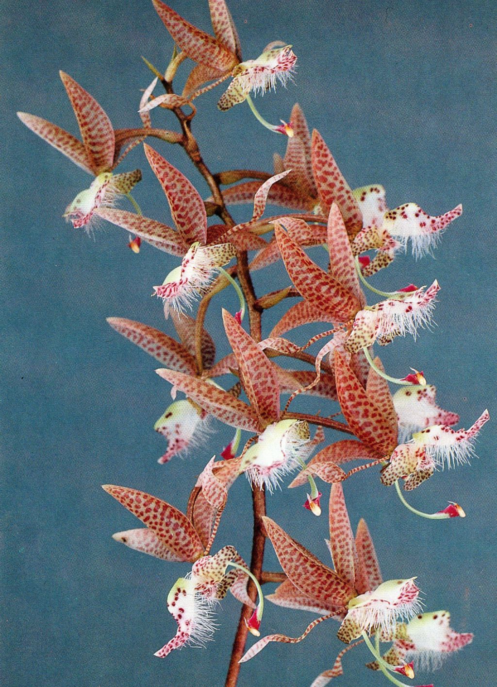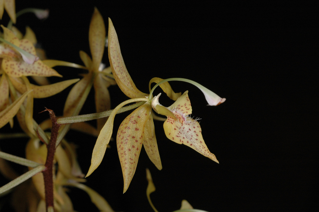 Found in Costa Rica, Panama, Colombia, Ecuador and Peru in very wet montane forests at elevations of 600 to 1200 meters as a miniature to small sized, warm growing epiphyte or terrestrial on steep banks with pyriform-cylindric pseudobulbs enveloped by evanescent sheaths and carrying a single, apical, plicate, elliptic, acute, cuneate below into the elongate, petiolate base leaf that blooms in the late spring through fall on a basal, pendant to arcuate, densely short-pubescent, to 18" [45 cm] long, many flowered inflorescence with 3 to 4 loose sheaths