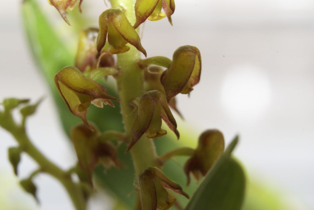Found in Nigeria, Togo, Cameroon, Gabon and Equatorial Guinea in evergreen forests at elevations around 500 meters as a miniature sized, hot to warm growing epiphyte with spindle-shaped, superposed, clumping pseudobulbs enveloped by dry, brown sheaths and carrying 8 to 9, disitichous, straqp-shaped, glossy green, articulated to the sheath below leaves that blooms in the summer on a basal, 3.6 to 4" [9 to 10 cm] long, one to 3 branched, many flowered inflorescence.