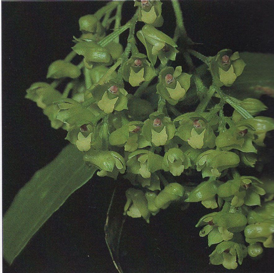 Found in Rwanda, Uganda and southwestern Kenya in forests at elevations of 1000 to 2350 meters as a mini-miniature to small sized, cool to cold growing, pendulous epiphyte with superposed, arising from the middle of the previous growth, cylindrical to more or less fusiform pseudobulbs enveloped basally by leaf sheath bases carrying 3 to 5, more or less spreading, lanceolate to ligulate-oblong, acute leaves that blooms in the spring on a laxly 3 to 4 branching, peduncle .8 to 1.2" [2 to 3 cm] long, slender, slightly compressed, pubescent 1.6 to 2.8" [4 to 7 cm] long overall, many flowered inflorescence with lanceolate, acuminate floral bracts.